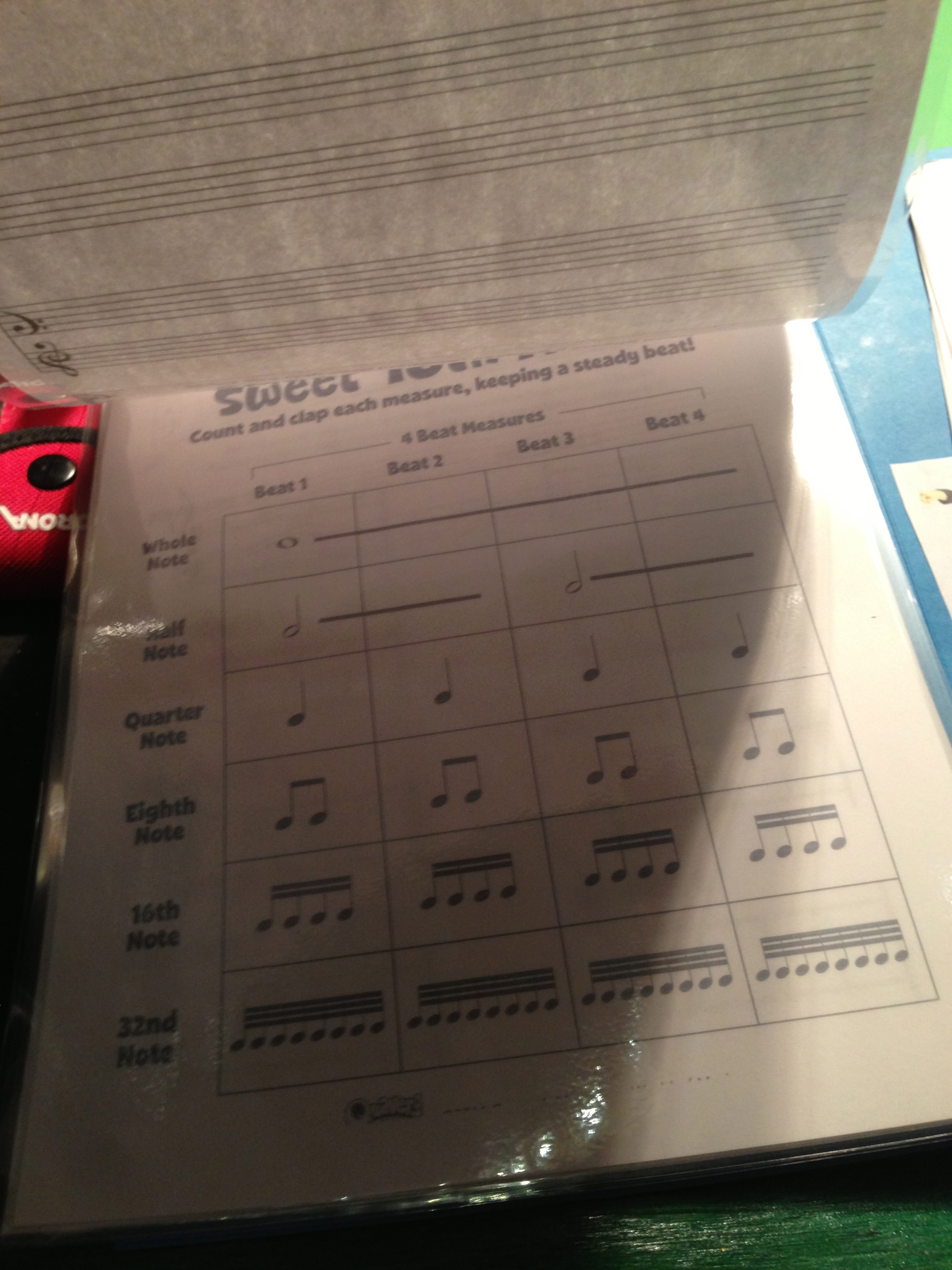 The next 2 things are two different flashcards that I hole punched together and using a brad, attached to the folder itself. The first set is another set of rhythm cards from the 123homeschool4me site for students to practice saying longer rhythms and maybe to start them into rhythmic notation where I would clap/play a rhythm and they would have to show the correct one on the set to me. (Assessment! Yay!) The second set is from the Quaver Dynamics classroom. I teach dynamic symbols in my upper grades and I thought these would be killer for a listening activity and mapping dynamics on a longer piece.