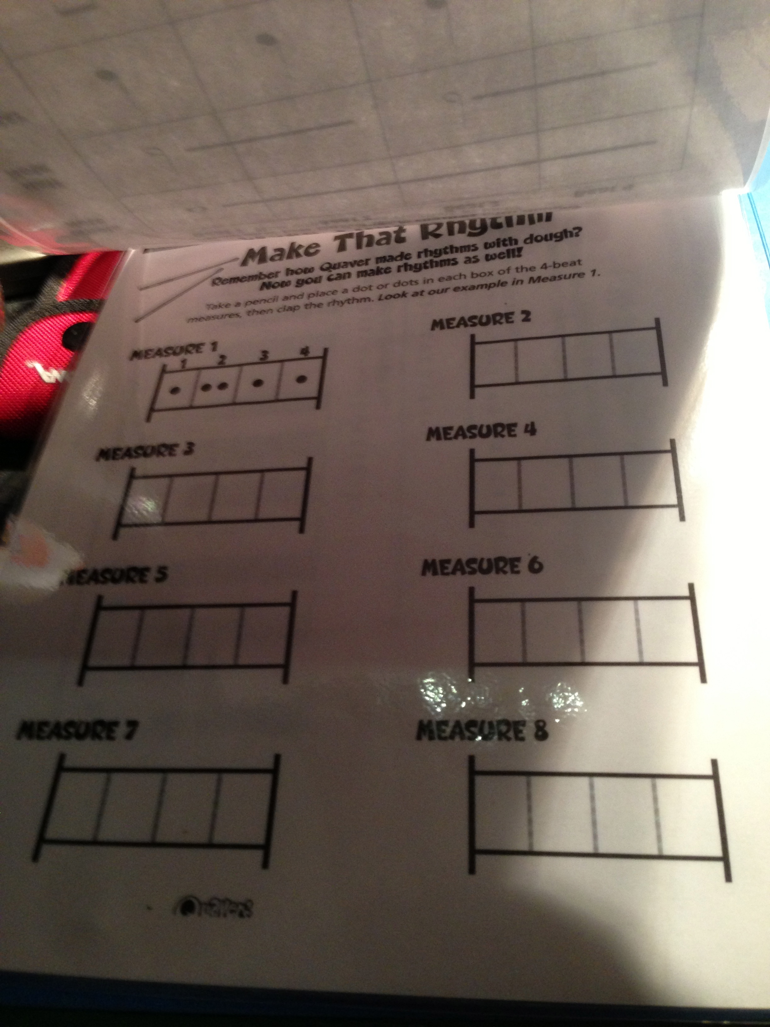 This is the Make That Rhythm worksheet from the Quaver Rhythm Classroom. This is laminated for lots of practice. When I start talking about making rhythms with my students I use dots instead of notes. I find they grasp the concept better because they only have to worry about the dots and not the note names.